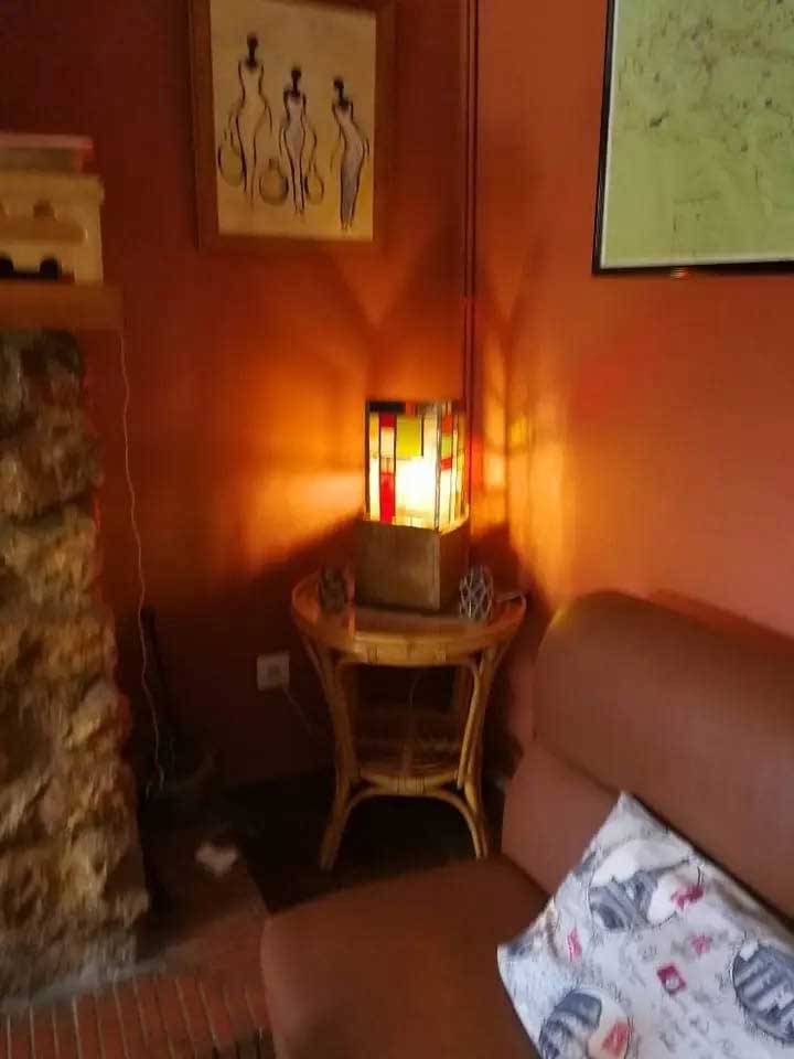 Lampara emplomada de forma cubica sobre base de madera y vidrio art-glass